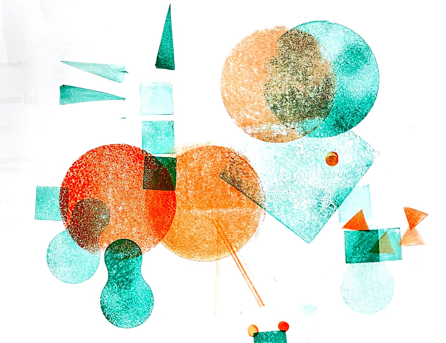 We also stamp basic shapes in 2 groups, then swap sheets to crate characters by stamping with a complementary colour, using whatever was already on the page, and trying to remove any kind of pressure as there aren’t any expectations regarding the result. These images can be final or pure exploration to develop something further.