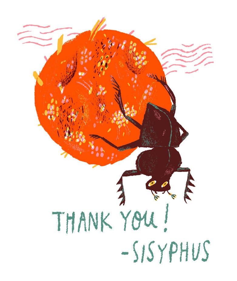 Some of the first test images I made for the book were a set of beetles, which ended up staying in the final version. One of them –a dung beetle– set the tone of the book by saying “Hi, I’m Sisyphus”, which I found quite funny. Those jokes and puns were not kept in the final, but the attitude of the characters was influenced by that part of the process. Some ants screaming for help after falling in a bottle of soda or a pelican being disgusted by an oil spill can still be seen on the final pages.